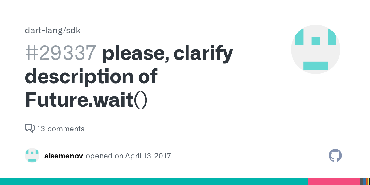Wait for the future to resolve before it moves on. This is a simple async function, with a future in. Connect and share knowledge within a single location that is structured and easy to search. If you need to run many asynchronous functions and wait for them all to complete before continuing something else, you can use static method: The remaining errors are silently dropped). An instance of the dart future class. Iterable < future > futures, { bool eagererror: In fact that is precisely what futures are for, to avoid code doing nothing or 'blocking' while waiting for data to arrive or an external process to finish. Future < list > wait (. False, void cleanup(successvalue) } ) wait for all the given futures to complete and collect their values. Iterable < future > futures, { bool eagererror: